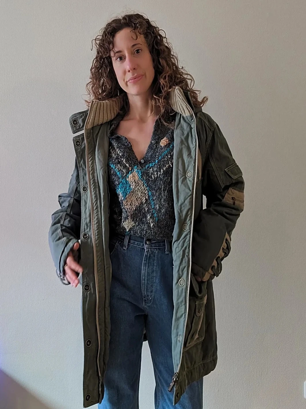 € 50,00Unique medium-sized 90s vintage green coat with hoodie awaits you. Mixed fabrics, excellent condition. Embrace the eras charm – only one available!