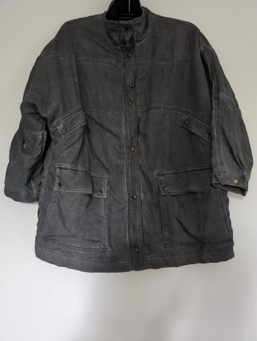 The jacket’s full closure is secured with snap buttons, and the collared neckline adds an extra layer of warmth against the wind. Its melange grey color and casual style make it a versatile addition to any wardrobe, easily paired with a variety of outfits.