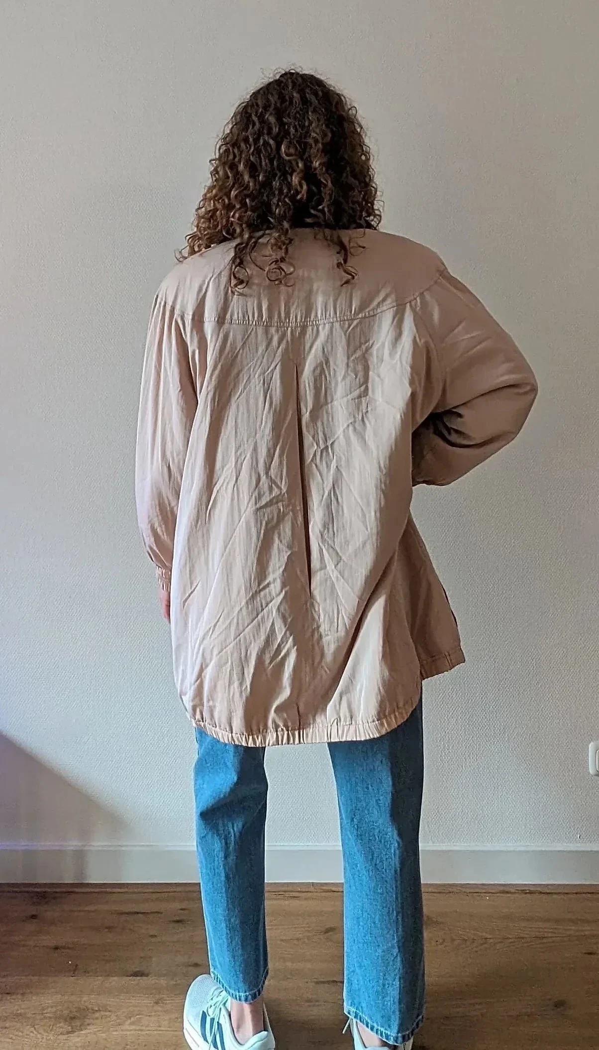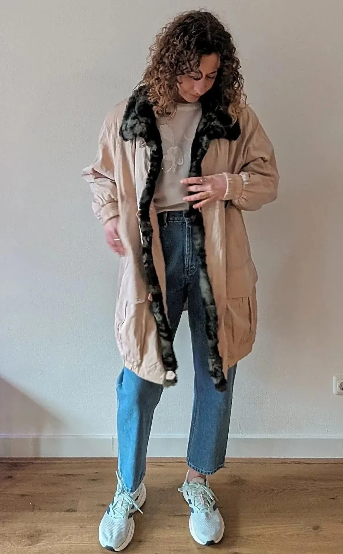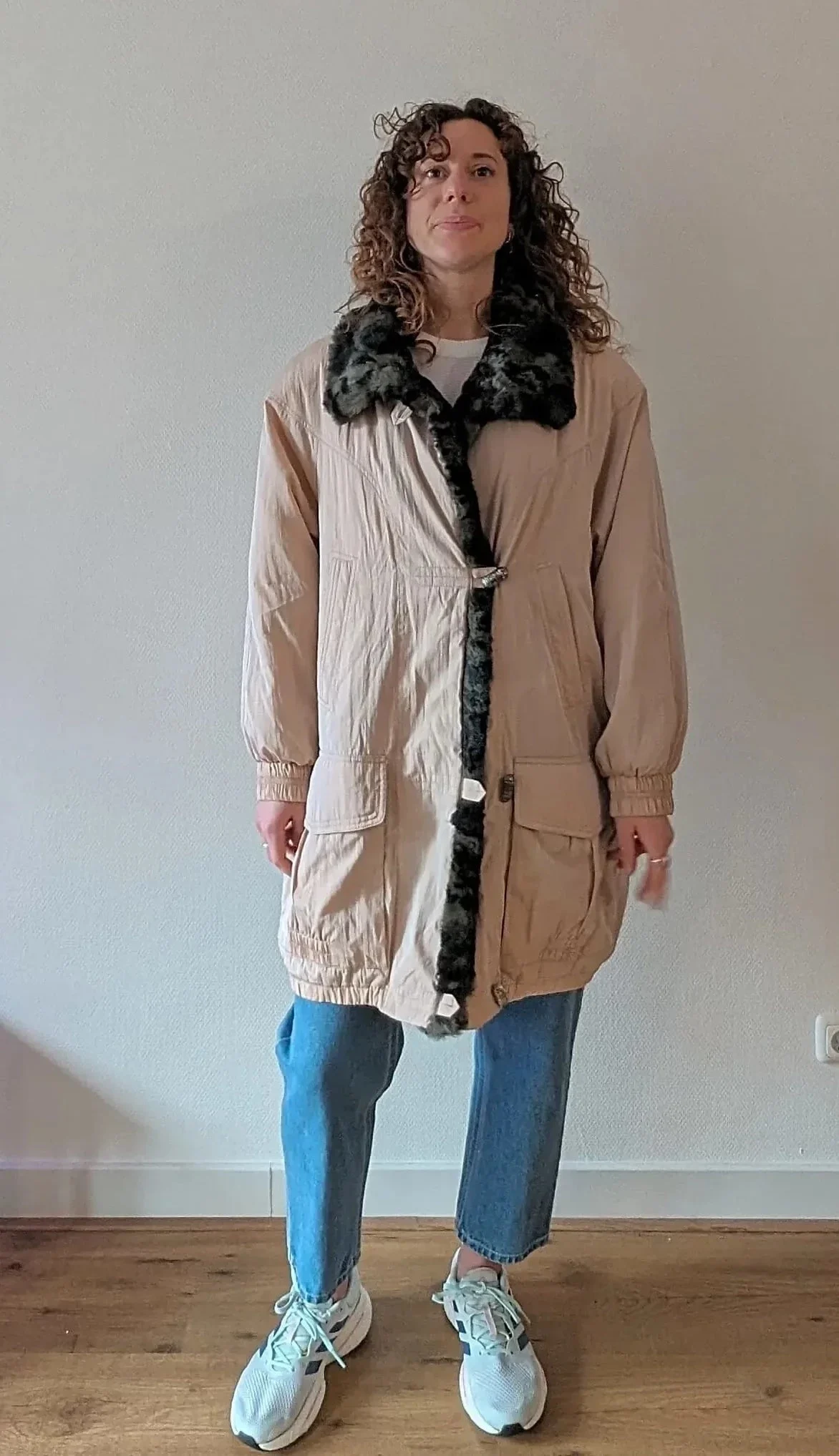 Wrapped in warmth, the coat features a faux fur lining in a rich brown hue that feels just as luxurious as it looks. The outer shell is a classic beige, versatile enough to pair with just about anything in your closet. With long sleeves to keep the cold at bay, this coat is tagged as a size large, but hey, don’t shy away from rocking it oversized as our model does – it’s a look that’s both comfy and stylish.