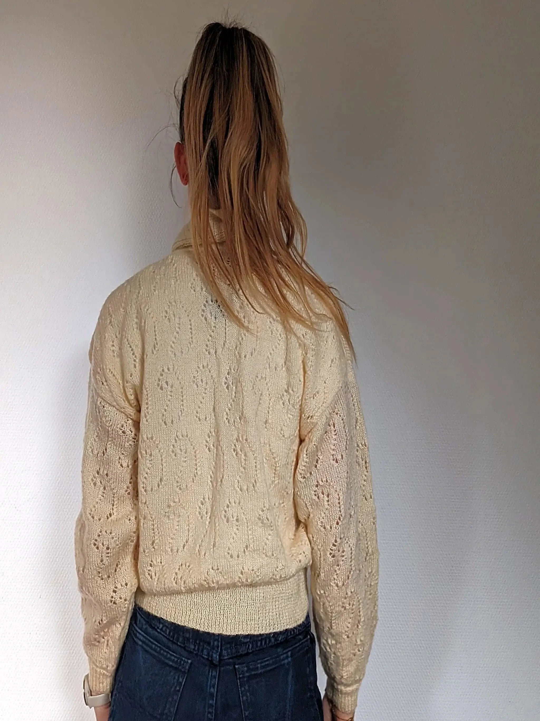Crafted from wool, this knitwear features a subtle, intricate pattern that's woven right in, giving it that extra bit of texture and depth. The photos really do it justice, showcasing the craftsmanship. Now, size-wise, it's a bit of a chameleon. If you're a small (S), it'll fit just right, but if you're a medium (M) and love a snugger fit, especially when pairing with high-waisted bottoms, this sweater's got you covered.