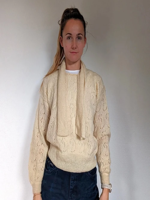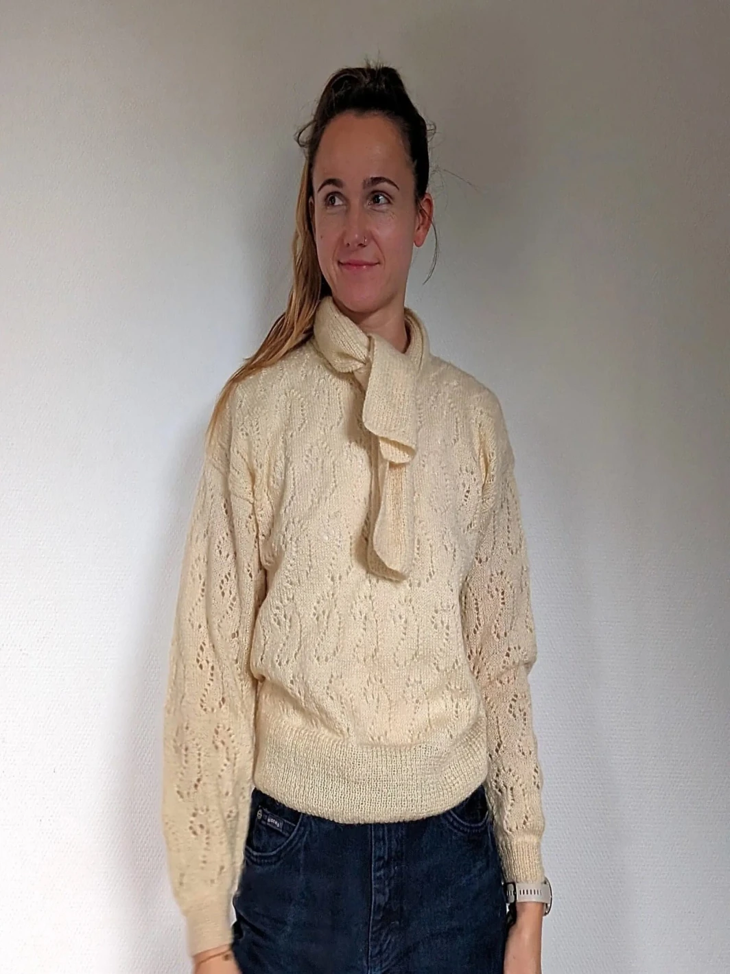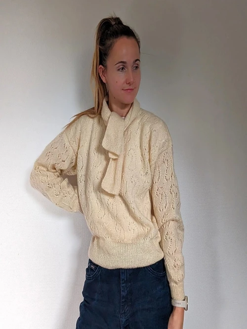 Oh, hello there! Let's chat about this charming beige sweater that's straight out of the 1970s. It's got this delightful scarf-like collar that adds a touch of elegance, and you can style it in a couple of ways. Fancy a laid-back look? Let the collar hang loose in flaps. Or, if you're feeling a bit more dapper, tie it up into a neat bow. It's that versatile piece that nods to the blouse styles of the era.