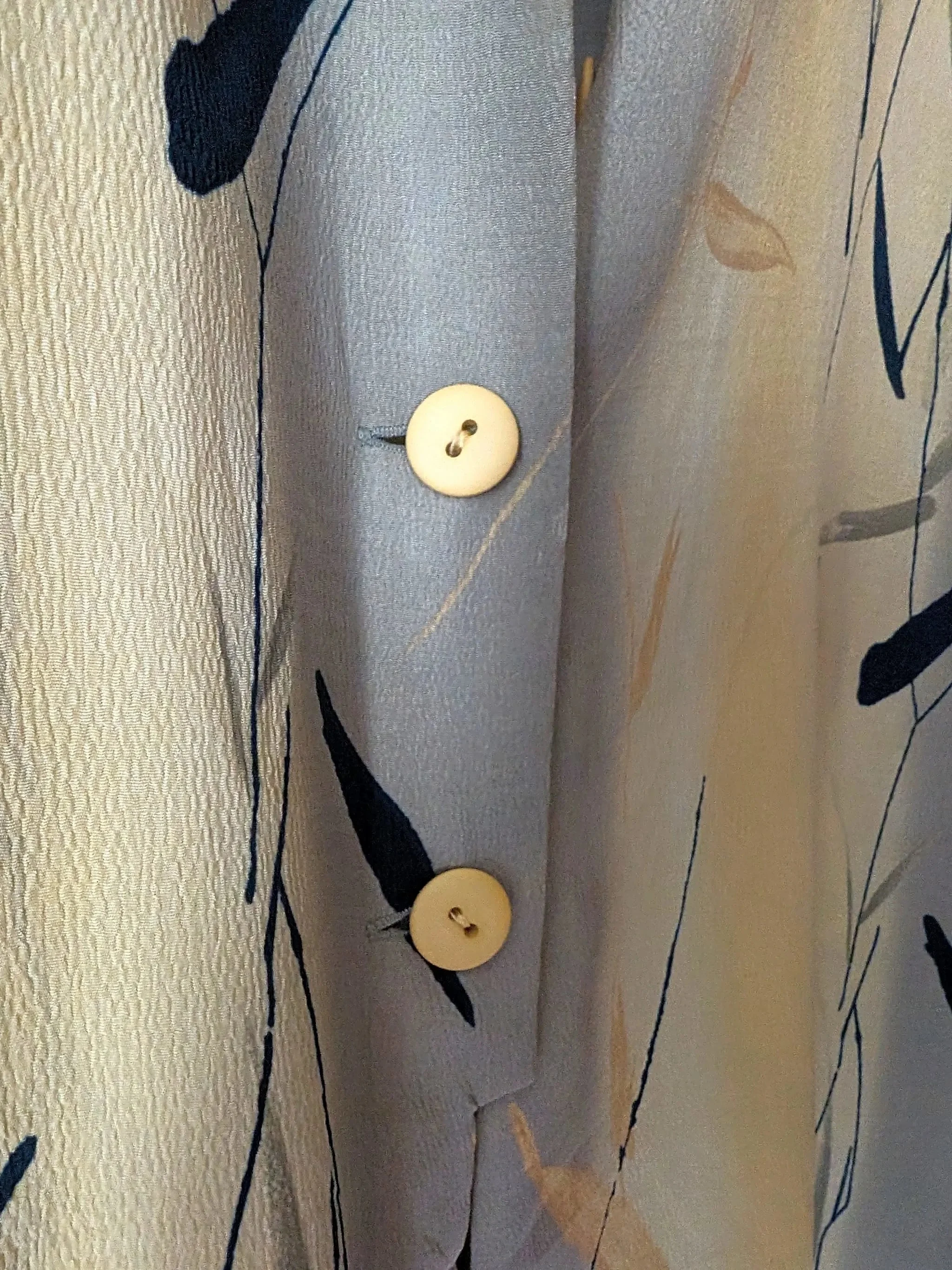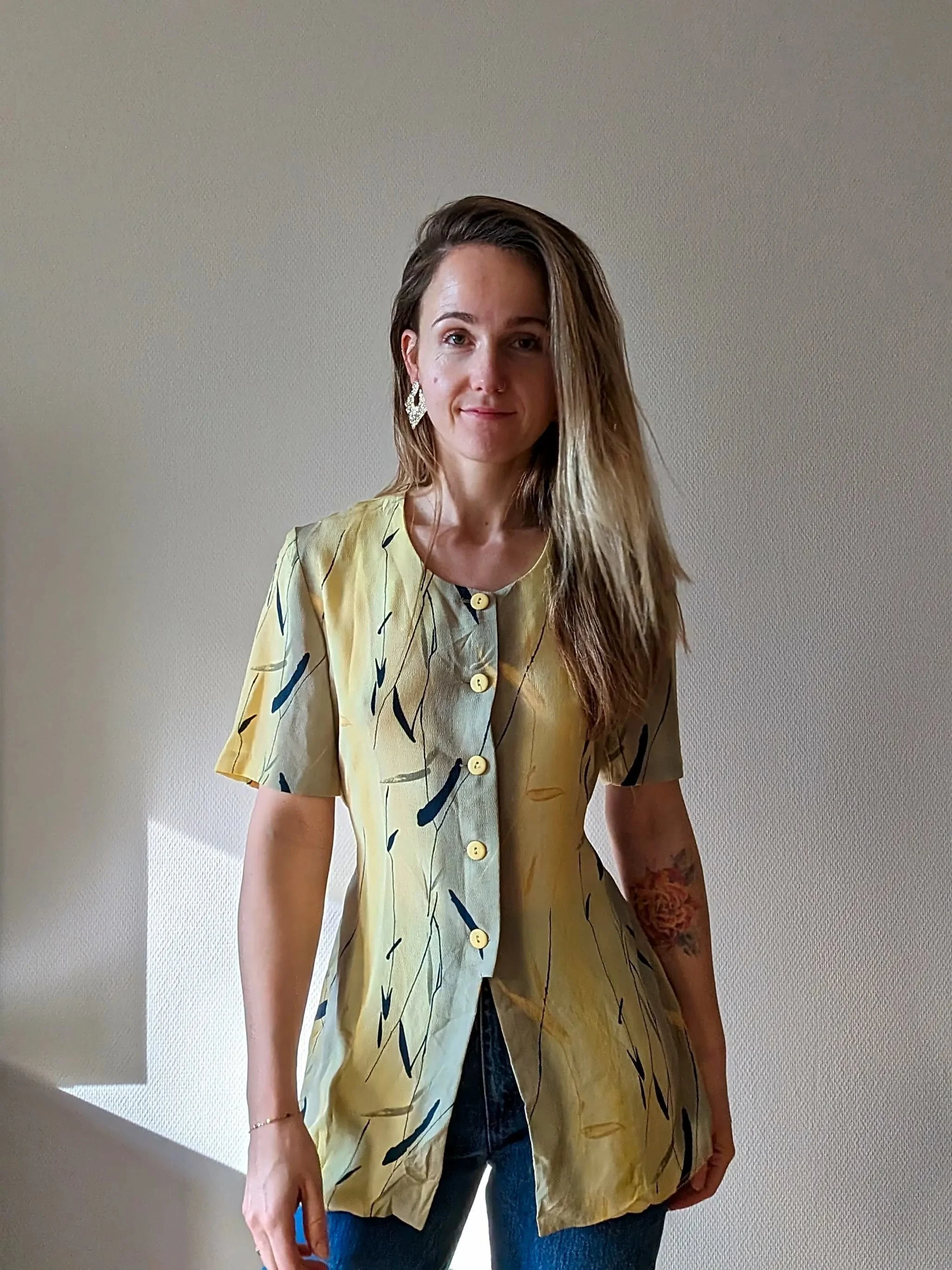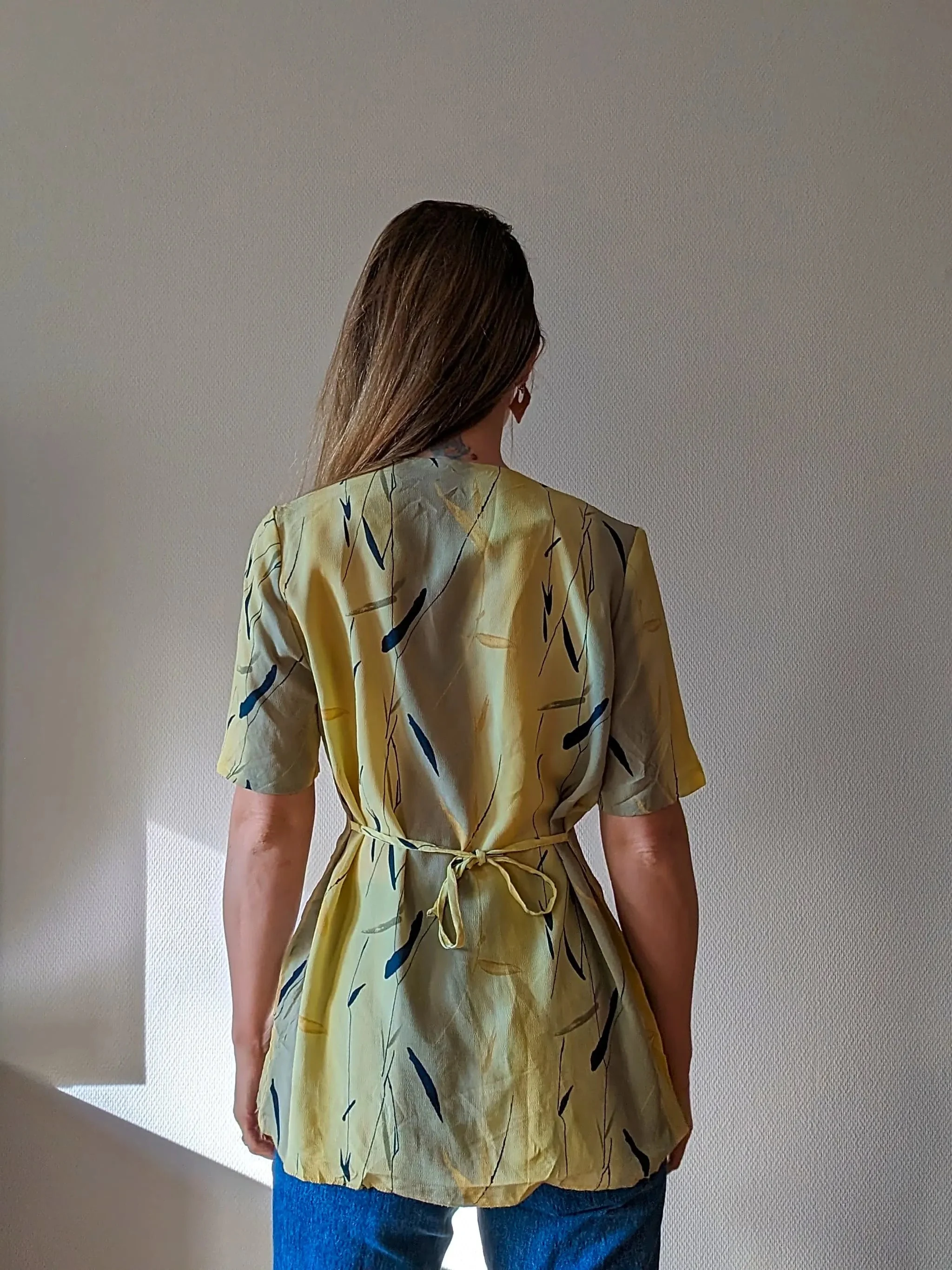 Oh, hello sunshine! This Charles Laurent blouse is like a little slice of the late 80s to early 90s, served up in a light yellow with pops of dark blue and a hint of green – talk about a color combo that’s as refreshing as a spring morning. Made with love in France, it’s got that vintage charm that whispers, “I’m special.”