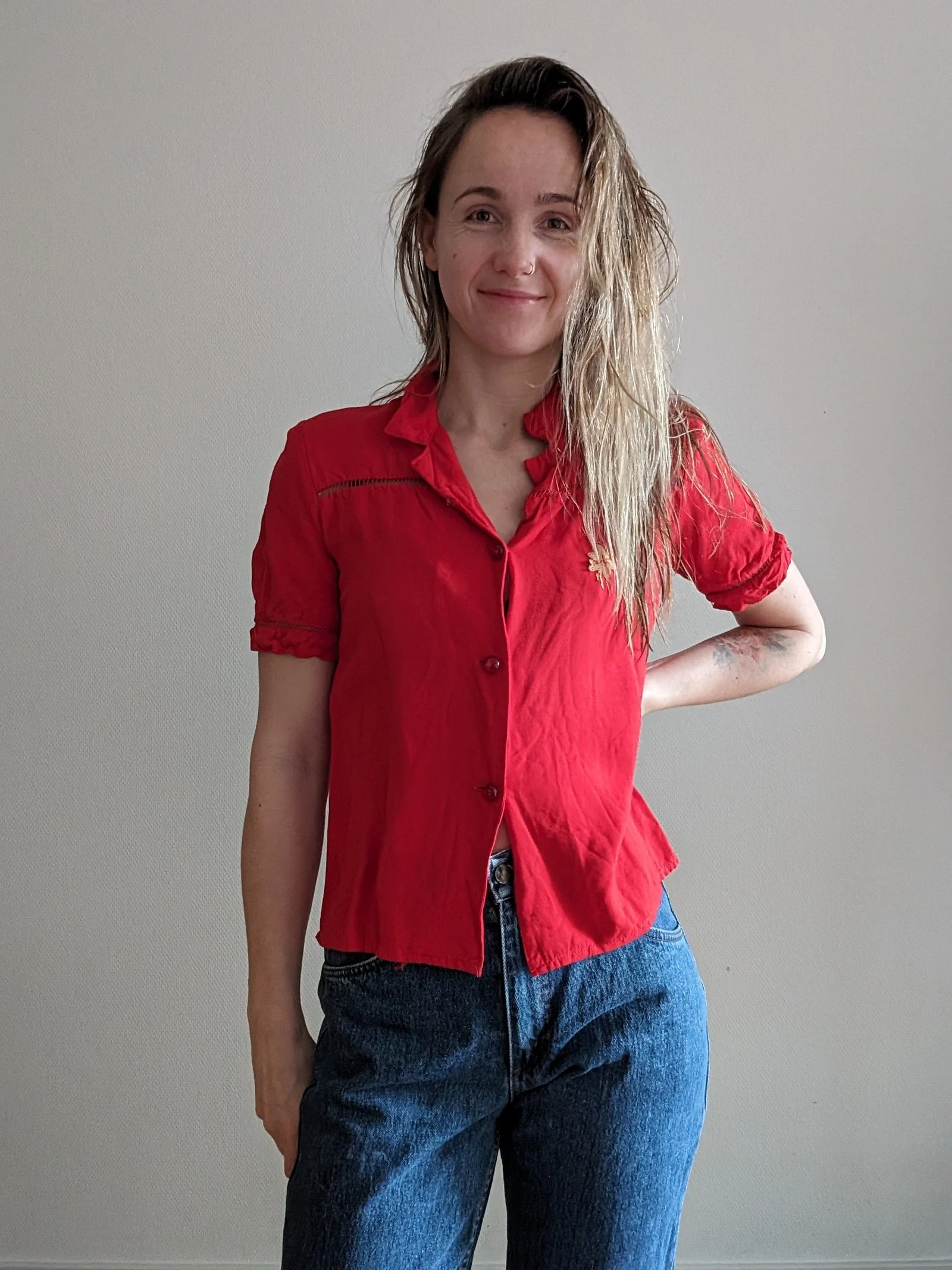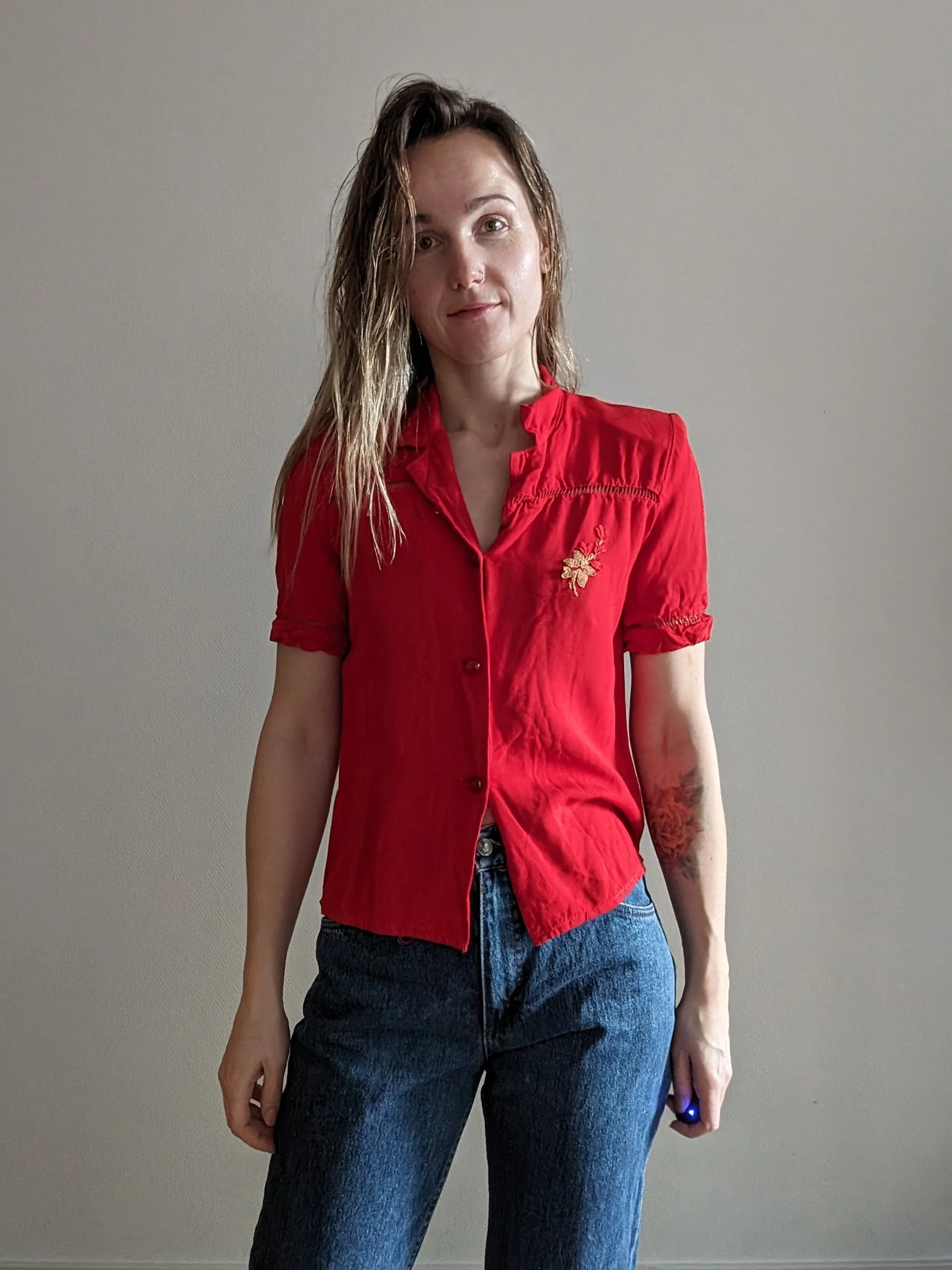 Hey there, vintage aficionados! Feast your eyes on this radiant red blouse straight from the 1970s, a true cotton classic. It’s not just any red top; this one’s got character with a charming little collar that leads down to a row of red buttons, adding a touch of nostalgia to your look. And let’s talk about the darling detail – an embroidered floral motif sitting pretty on the left side of the chest, giving you that subtle, “picked from a wildflower field” vibe.