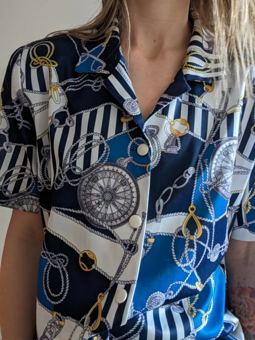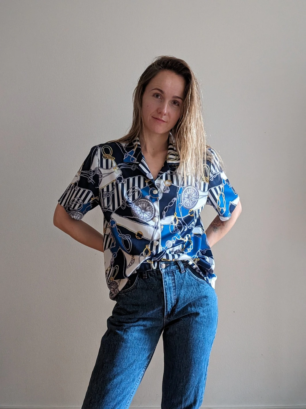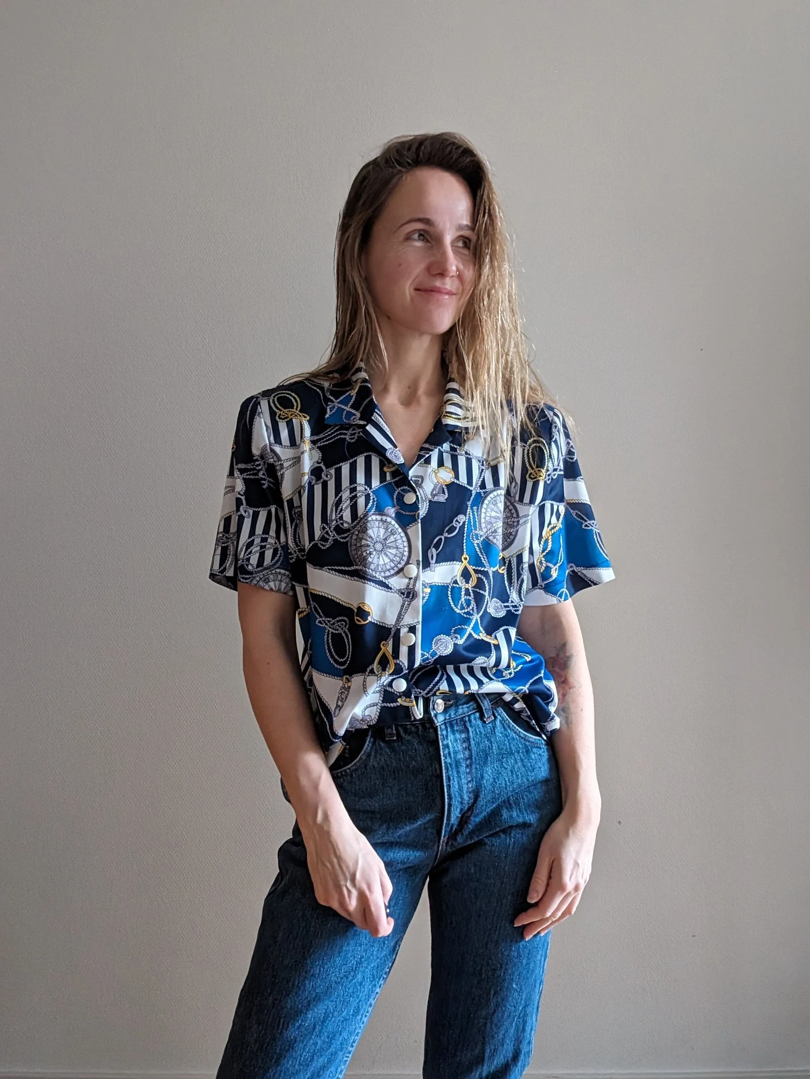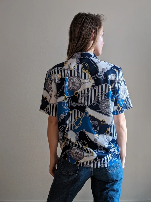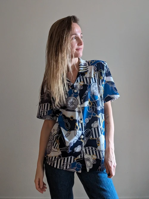 Step back into the 80s with this fabulous vintage blouse that’s just bursting with retro charm! Crafted in the UK, this top is a little time capsule with its quintessentially 80s pattern – think bold, think vibrant, think totally rad. The color palette is a cool mix of blue, white, and black, with just a hint of yellow to catch the eye and add a pop of fun.