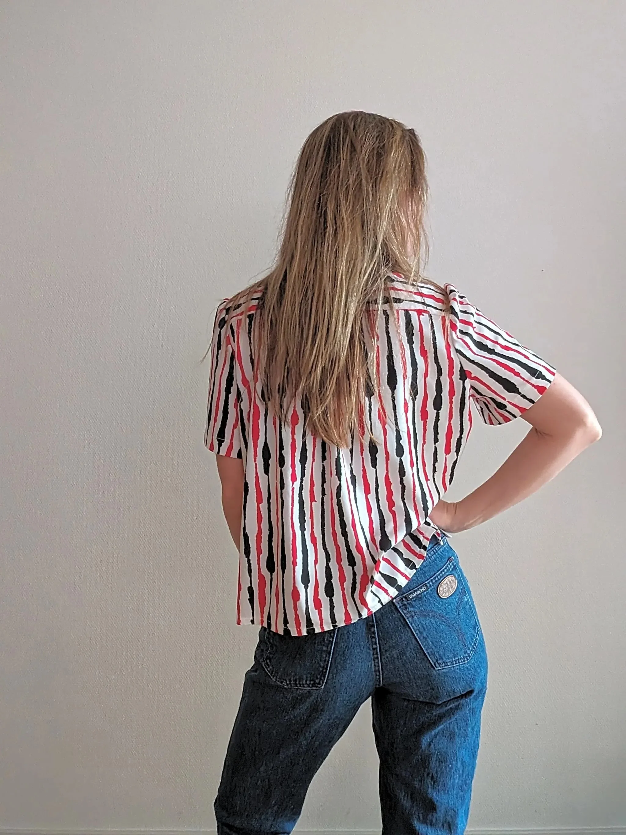 Styling this top is a breeze. Slip into some flared jeans or corduroy pants to amp up the ’70s flair, or pair it with a sleek black skirt for a more modern twist. And if you’re feeling bold, a swipe of red lipstick will make the red in the shirt pop even more. It’s the perfect spring shirt for when you want to feel breezy and look effortlessly chic.
