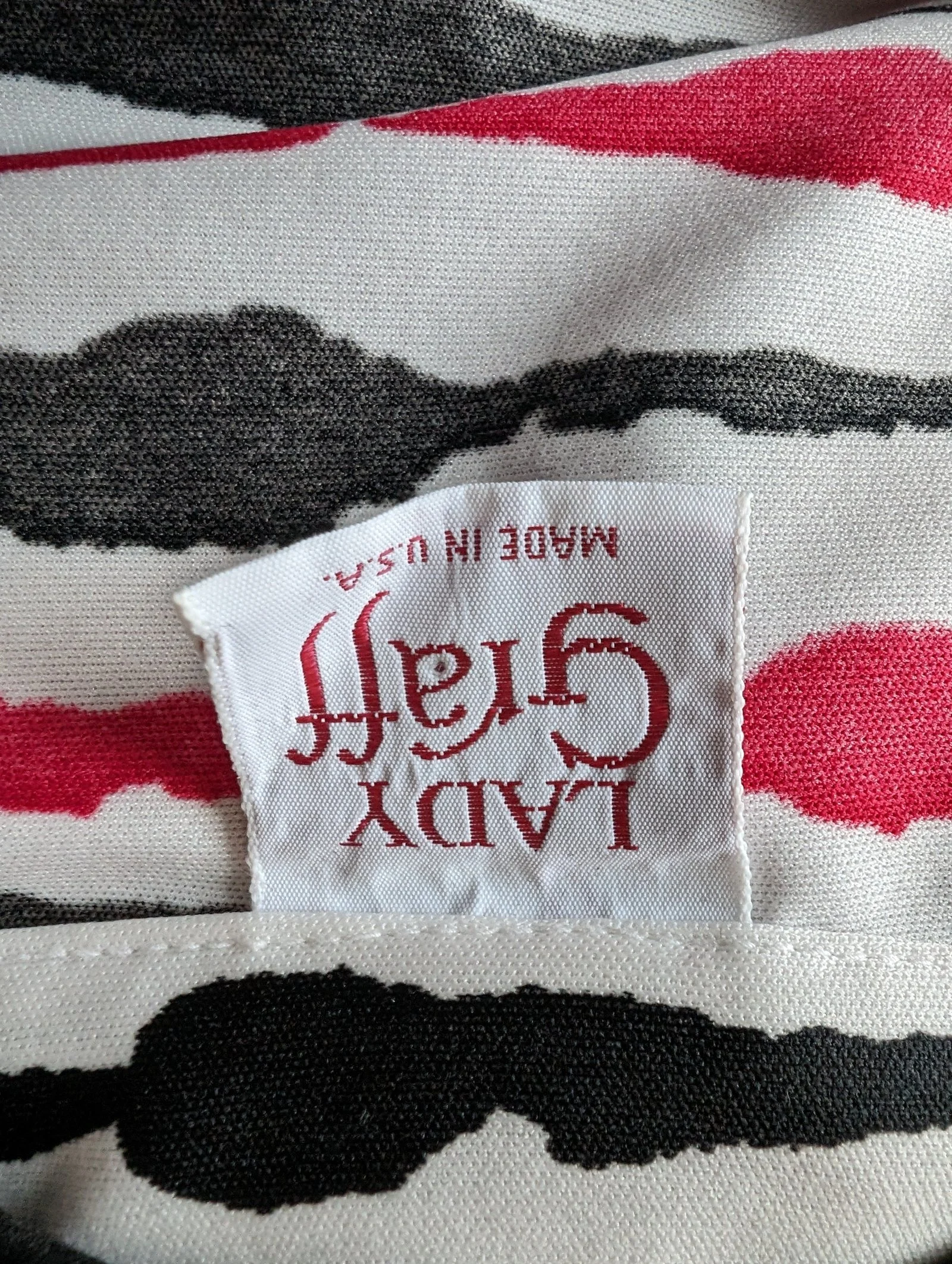 Loving these groovy 1970s vibes with this Lady Graff vintage top! It’s like a little time capsule that’s popped open to reveal a piece that’s just as stylish now as it was back in the day. This top is a charmer with its playful red and black pattern cascading down a crisp white fabric – think vertical drips that add a fun twist to your outfit.