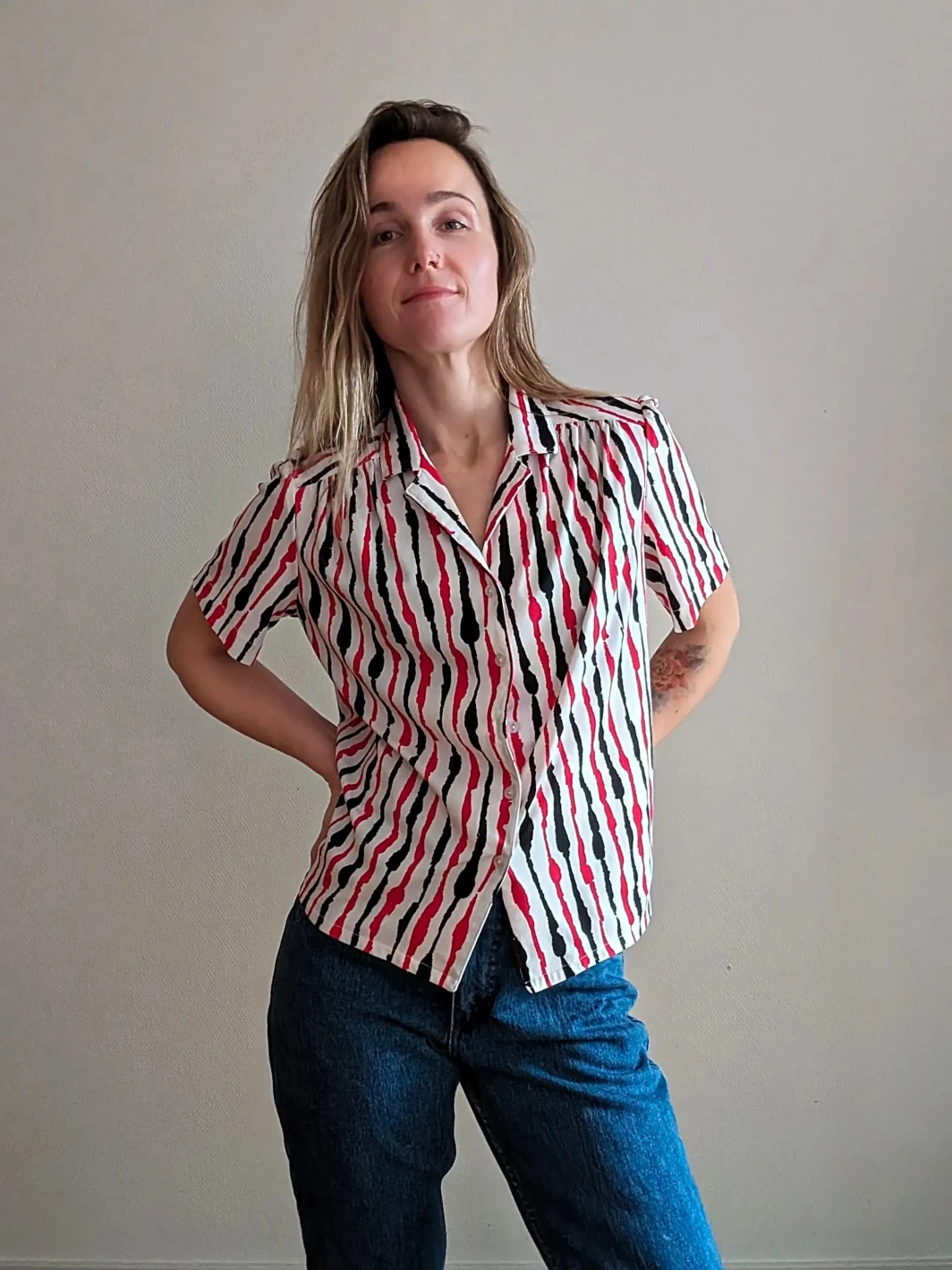 Styling this top is a breeze. Slip into some flared jeans or corduroy pants to amp up the ’70s flair, or pair it with a sleek black skirt for a more modern twist. And if you’re feeling bold, a swipe of red lipstick will make the red in the shirt pop even more. It’s the perfect spring shirt for when you want to feel breezy and look effortlessly chic.