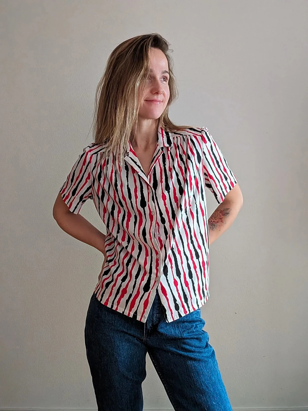 Loving these groovy 1970s vibes with this Lady Graff vintage top! It’s like a little time capsule that’s popped open to reveal a piece that’s just as stylish now as it was back in the day. This top is a charmer with its playful red and black pattern cascading down a crisp white fabric – think vertical drips that add a fun twist to your outfit.