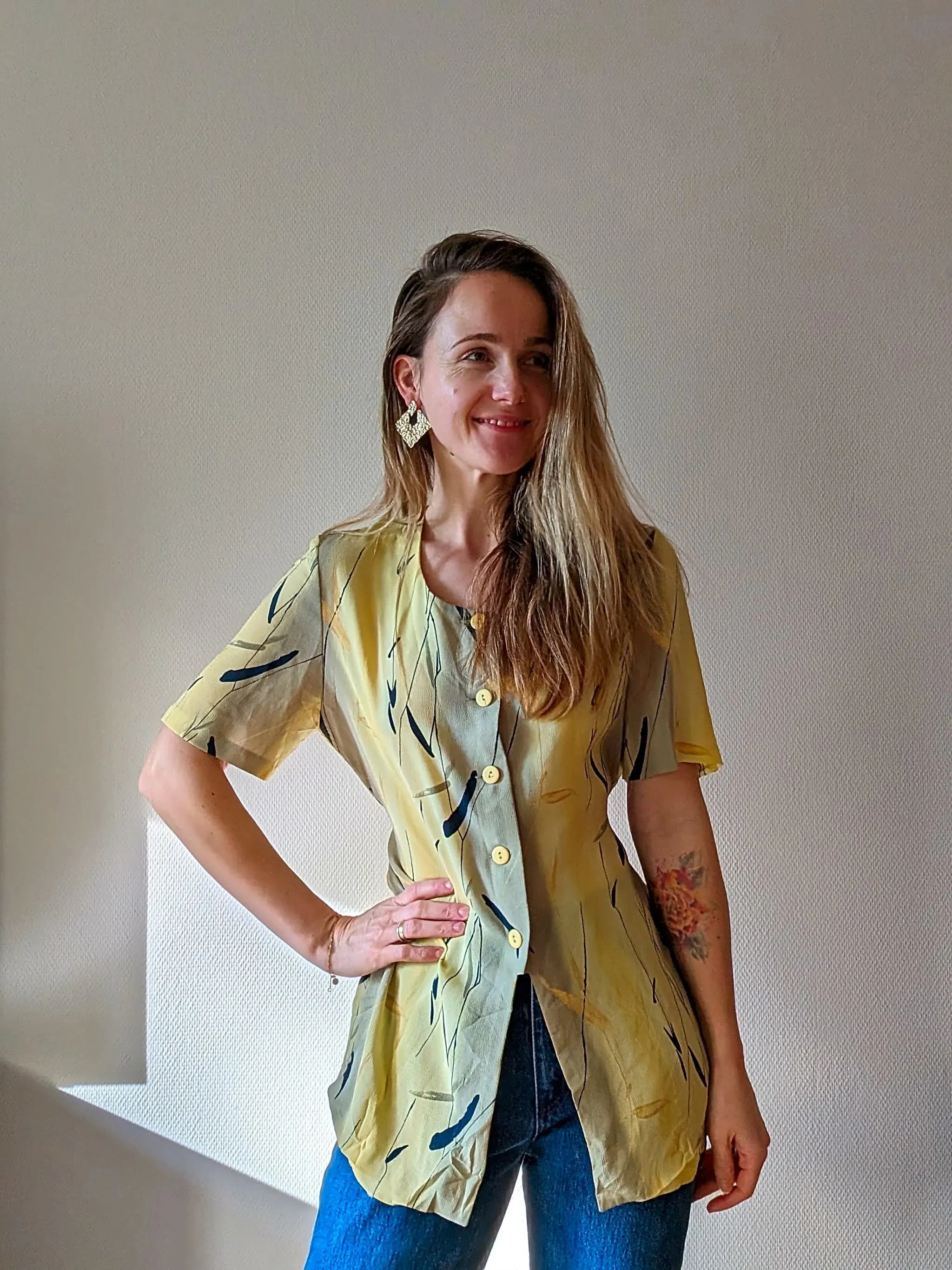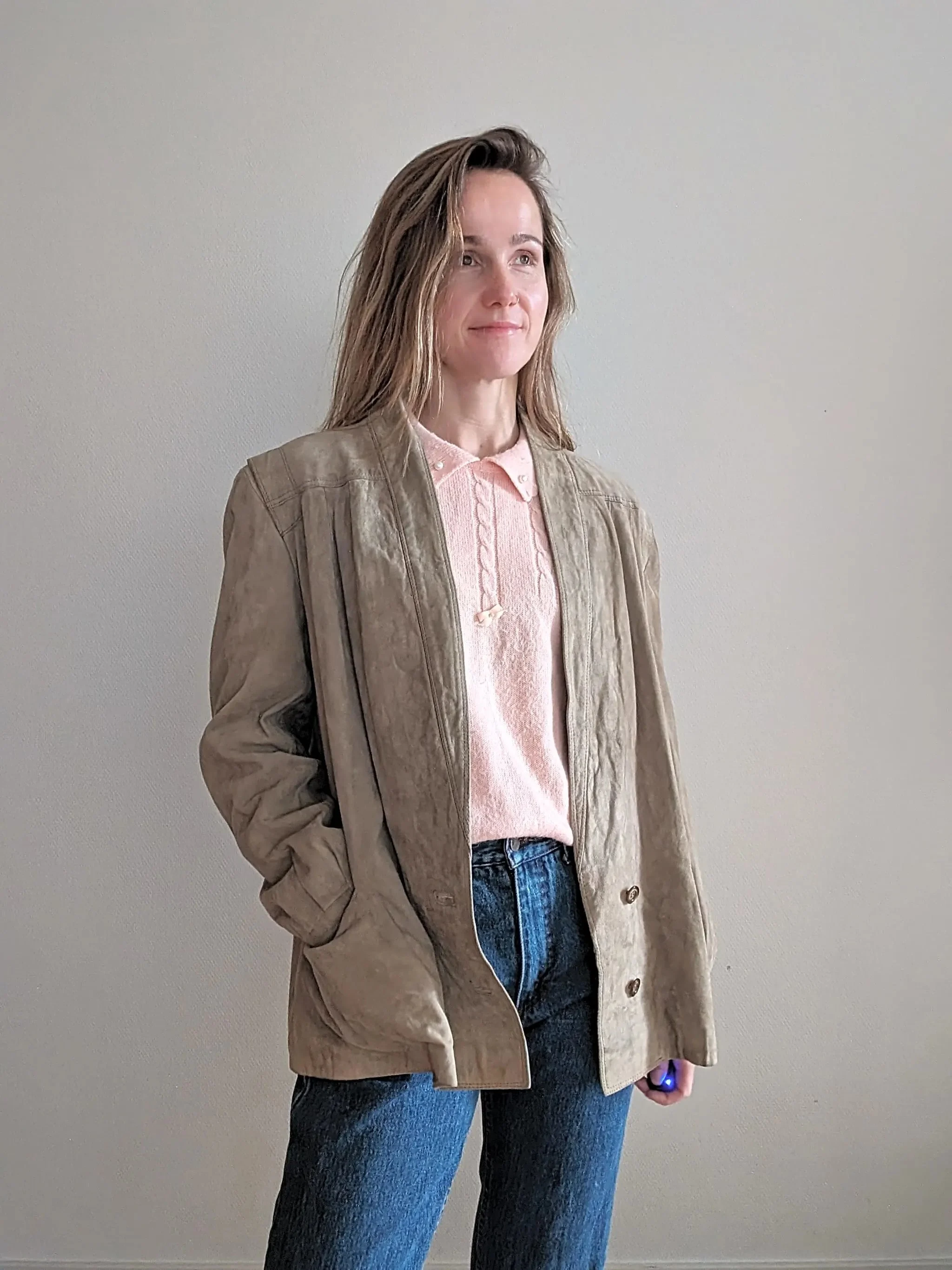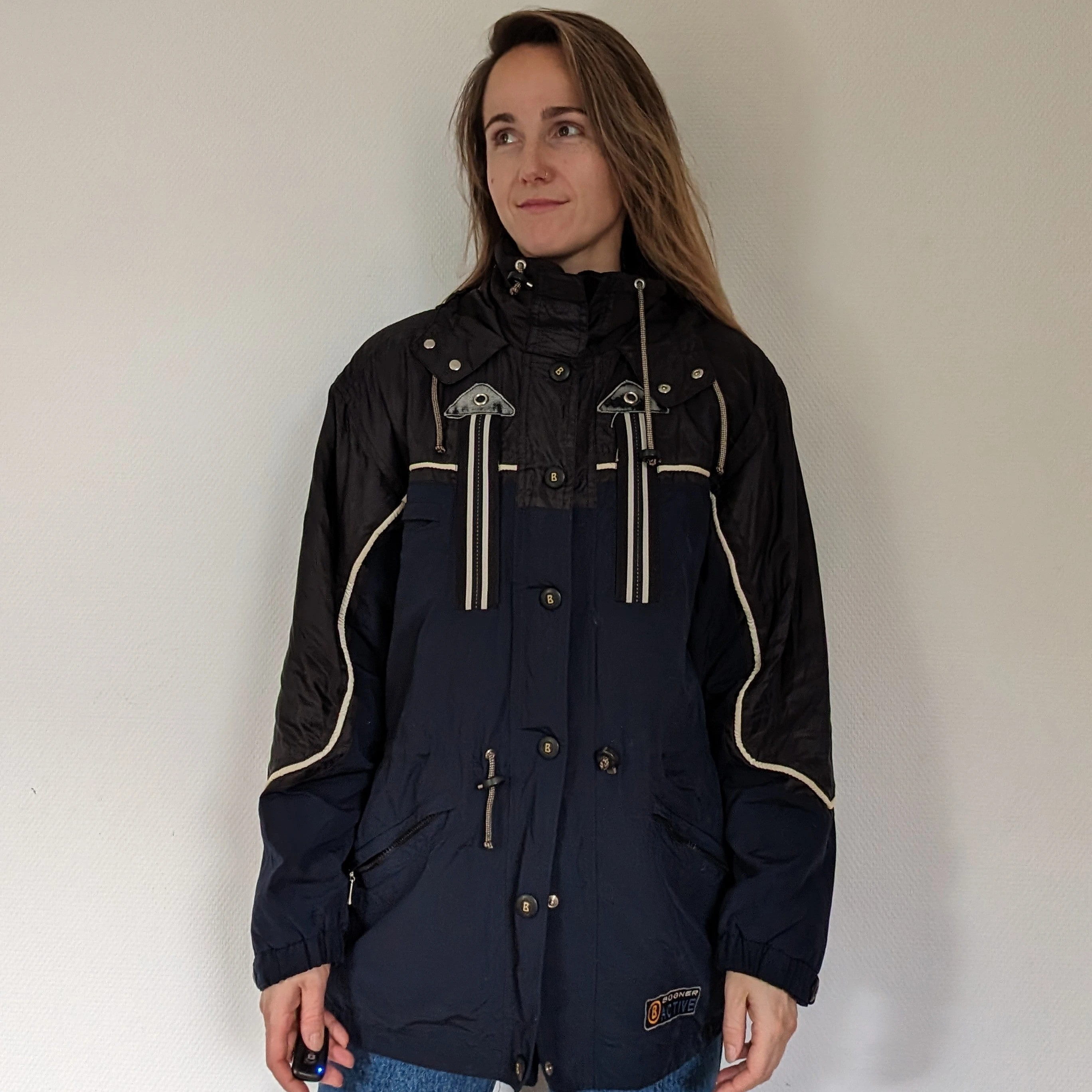 Condition-wise, we’re talking top-notch. It’s been loved, but you’d hardly know it – it’s in excellent shape, ready to strut its stuff once more. The label might say ‘L’ for large, but here’s a heads-up: it’s got a more tailored vibe. Think of it as a ‘small large’ or maybe a ‘medium with a little extra room’ – perfect for those who like their clothes with a bit of a snugger fit.