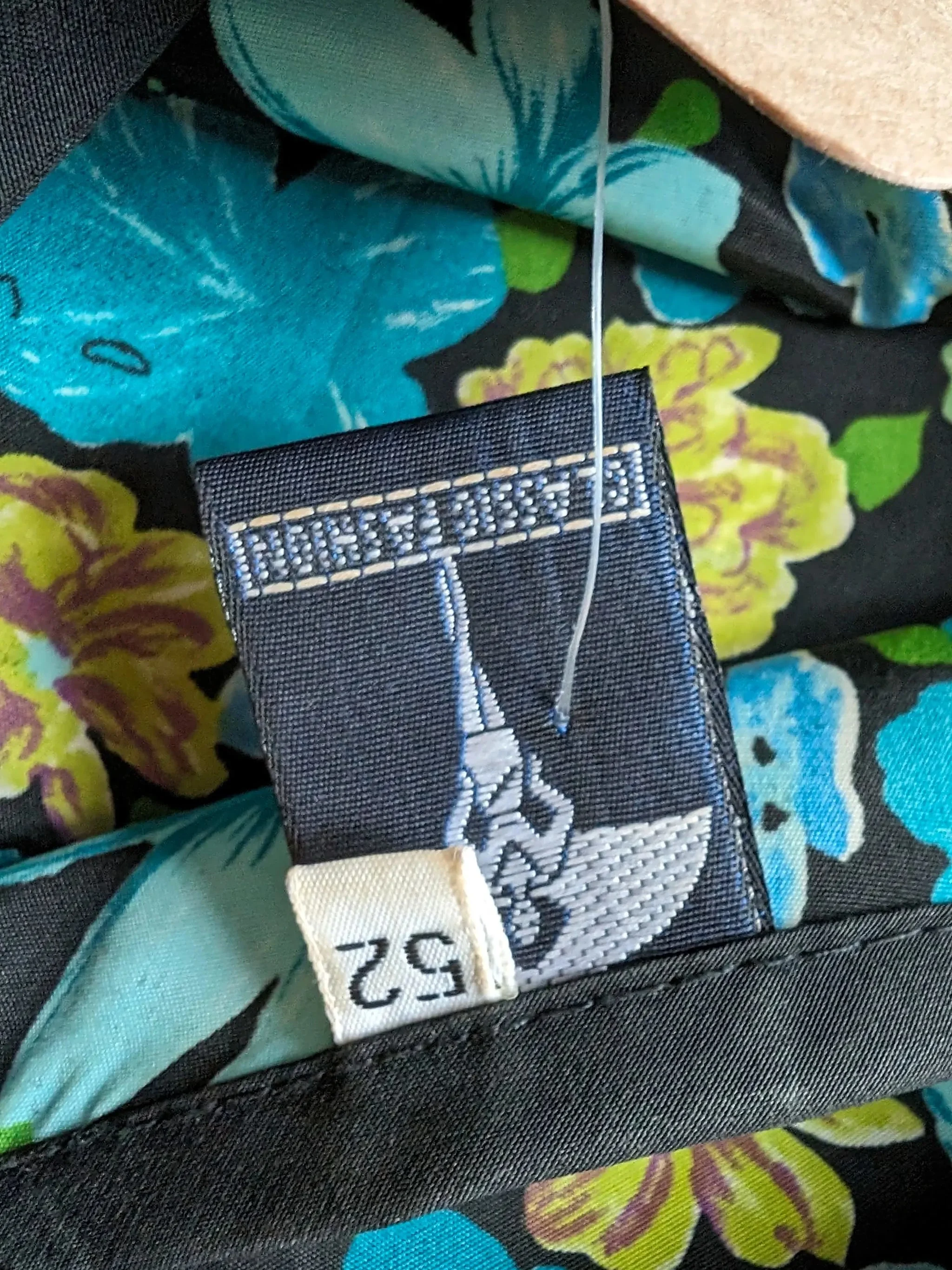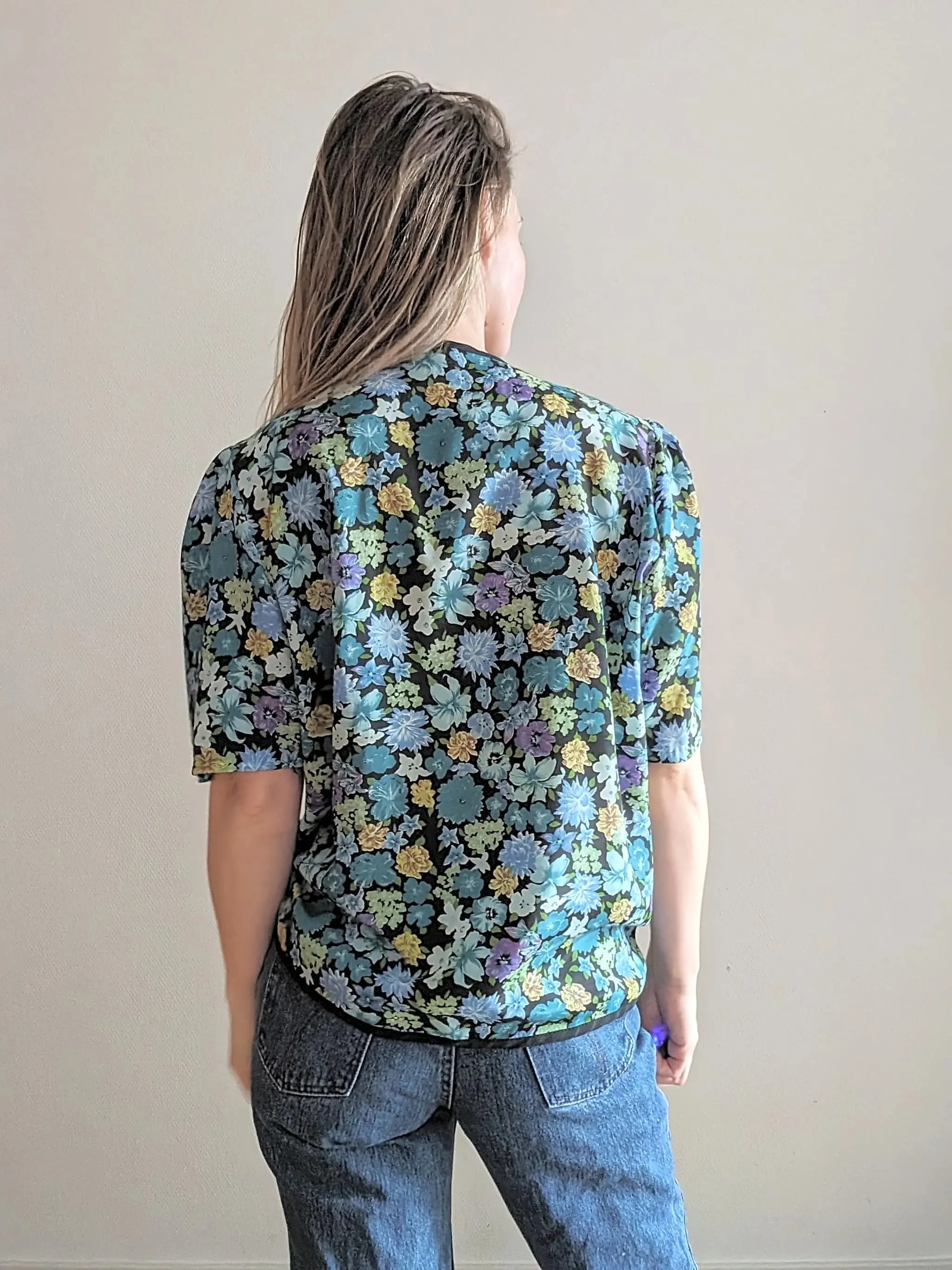 I love this delightful floral blouse from the 1980s that’s just waiting to add a pop of vintage flair to anyone’s wardrobe. Crafted in Italy, this piece is a testament to timeless style with its short sleeves and classic crew neck, making it a versatile pick for any fashion enthusiast. The blouse boasts a playful pattern in shades of blue, green, and black, with subtle gold accents that catch the light just right.