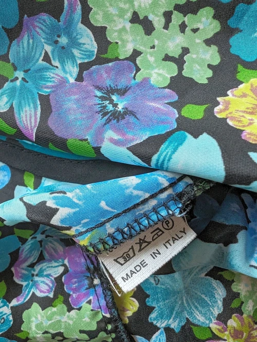 I love this delightful floral blouse from the 1980s that’s just waiting to add a pop of vintage flair to anyone’s wardrobe. Crafted in Italy, this piece is a testament to timeless style with its short sleeves and classic crew neck, making it a versatile pick for any fashion enthusiast. The blouse boasts a playful pattern in shades of blue, green, and black, with subtle gold accents that catch the light just right.