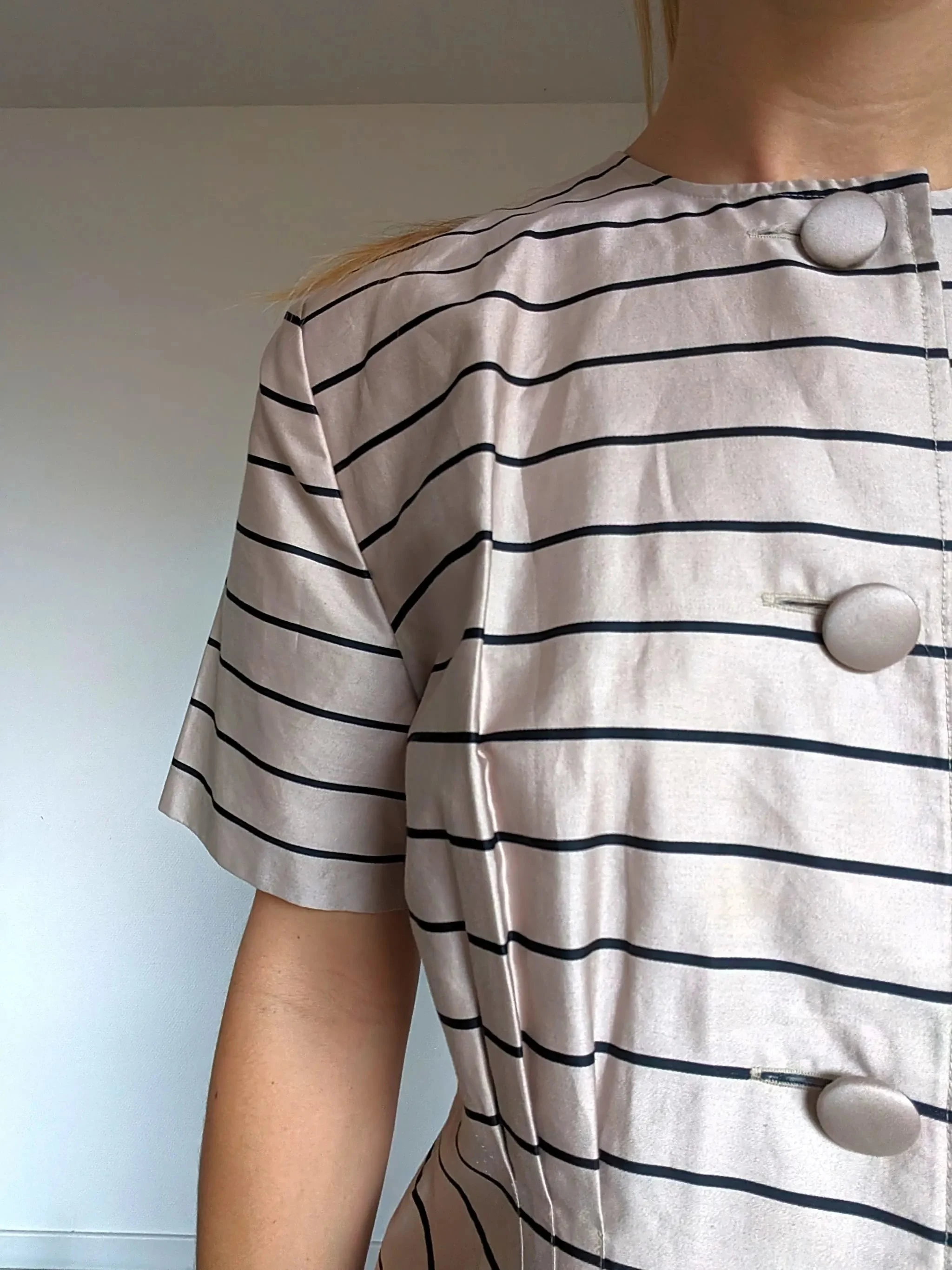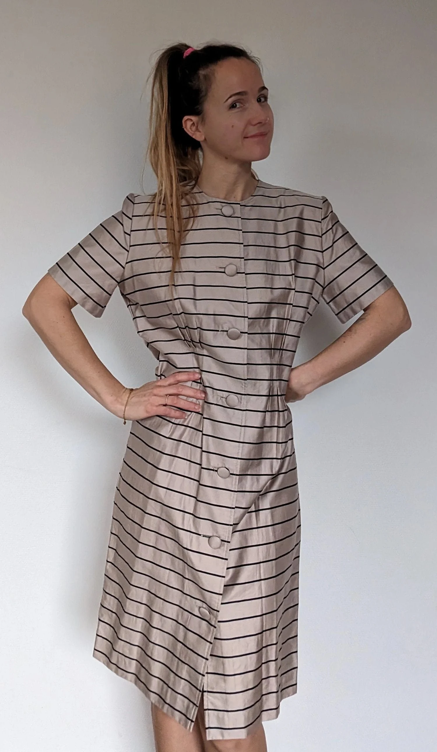 The front-button closure is cleverly designed with buttons that match the dress, maintaining a seamless and polished aesthetic. In excellent condition, this dress is a perfect pick for anyone looking to capture that classic French vibe with a hint of playfulness, thanks to the full button-down front.