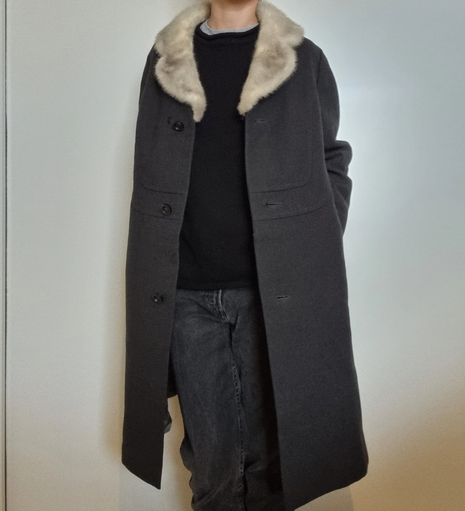 This coat is in great condition. It is made of 100% wool (see photos) with a lining and as mentioend a fur collar. You can wear it as a more formal coat or when you feel an inner diva needs to come out on a not so cold day.