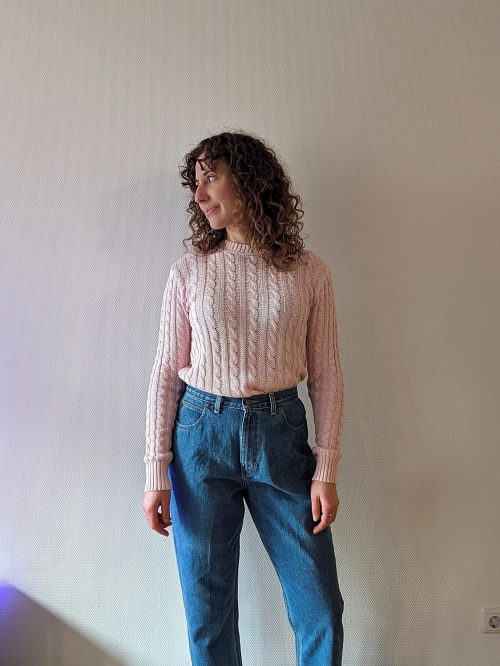 Oh, hello there! Feast your eyes on this darling soft pink sweater that's straight out of the 70s (with a great Lot number in the label) – talk about a throwback with style. With its knitted texture that gives it a distinctive character, this piece isn't just a sweater; it's a nod to a bygone era of fashion. It's got that crew neck and long sleeves combo that makes it a classic, and it's sized up as a cozy S, perfect for those who love a snug fit.