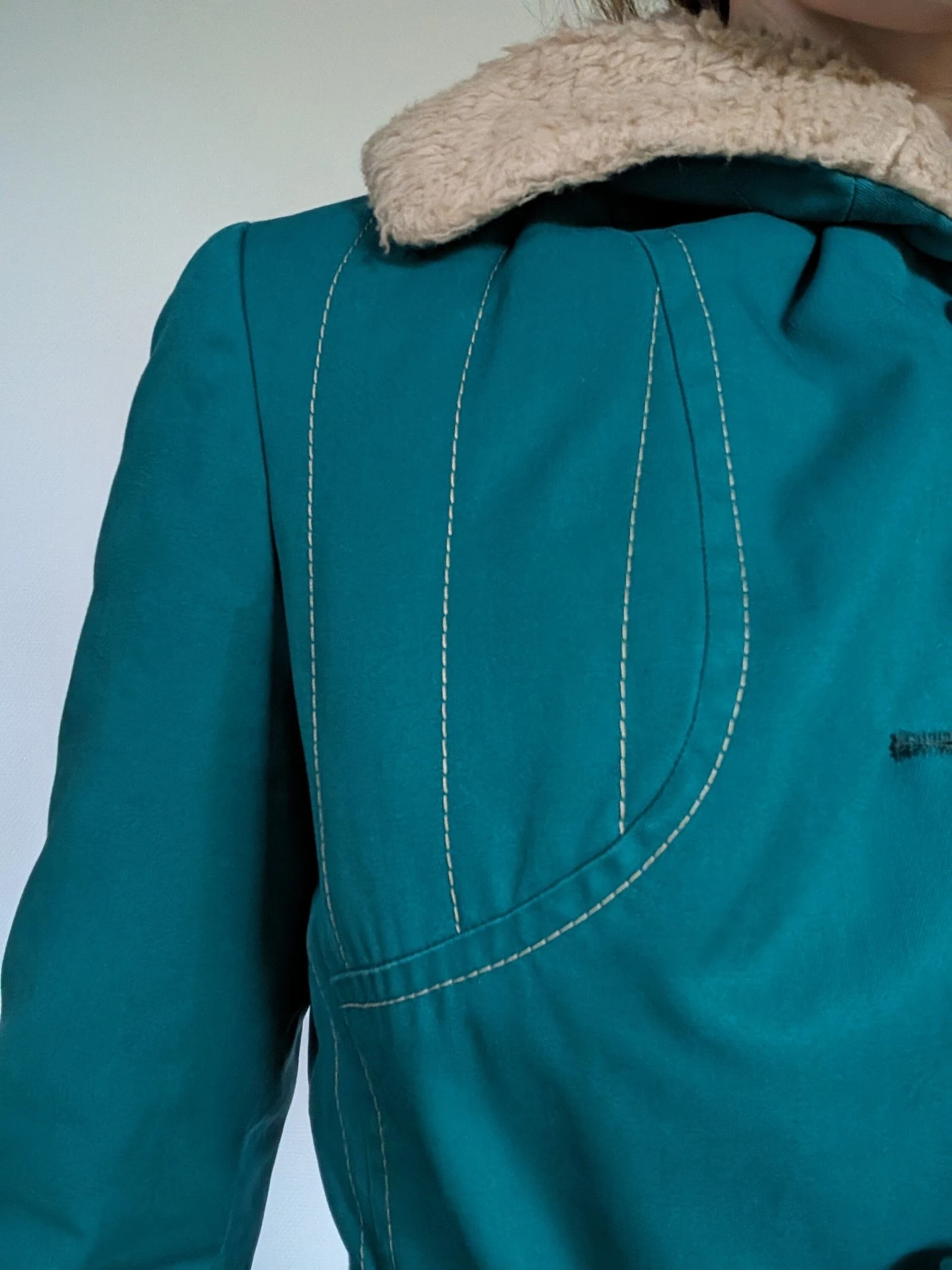Wrap yourself in a slice of the early ’70s with this Carol Prêt-à-Porter winter coat that’s all about understated elegance. Its turquoise hue, with a hint of green-blue, is like a breath of fresh air on a crisp winter day, while the light brown lining peeks out at the sleeves, adding just the right amount of contrast. The coat’s plain front is subtly enhanced by delicate seams, giving it a touch of texture without overwhelming its classic style.