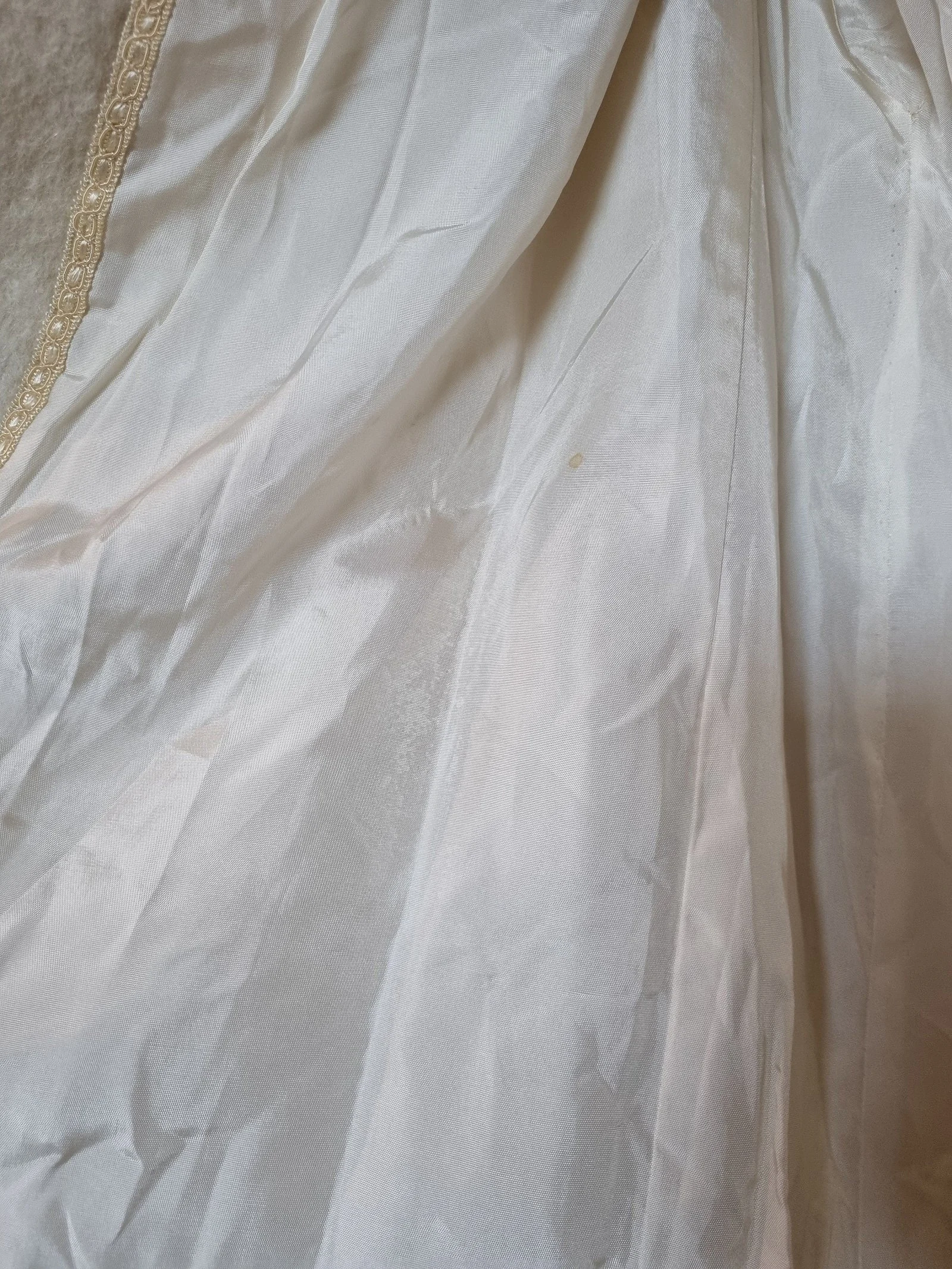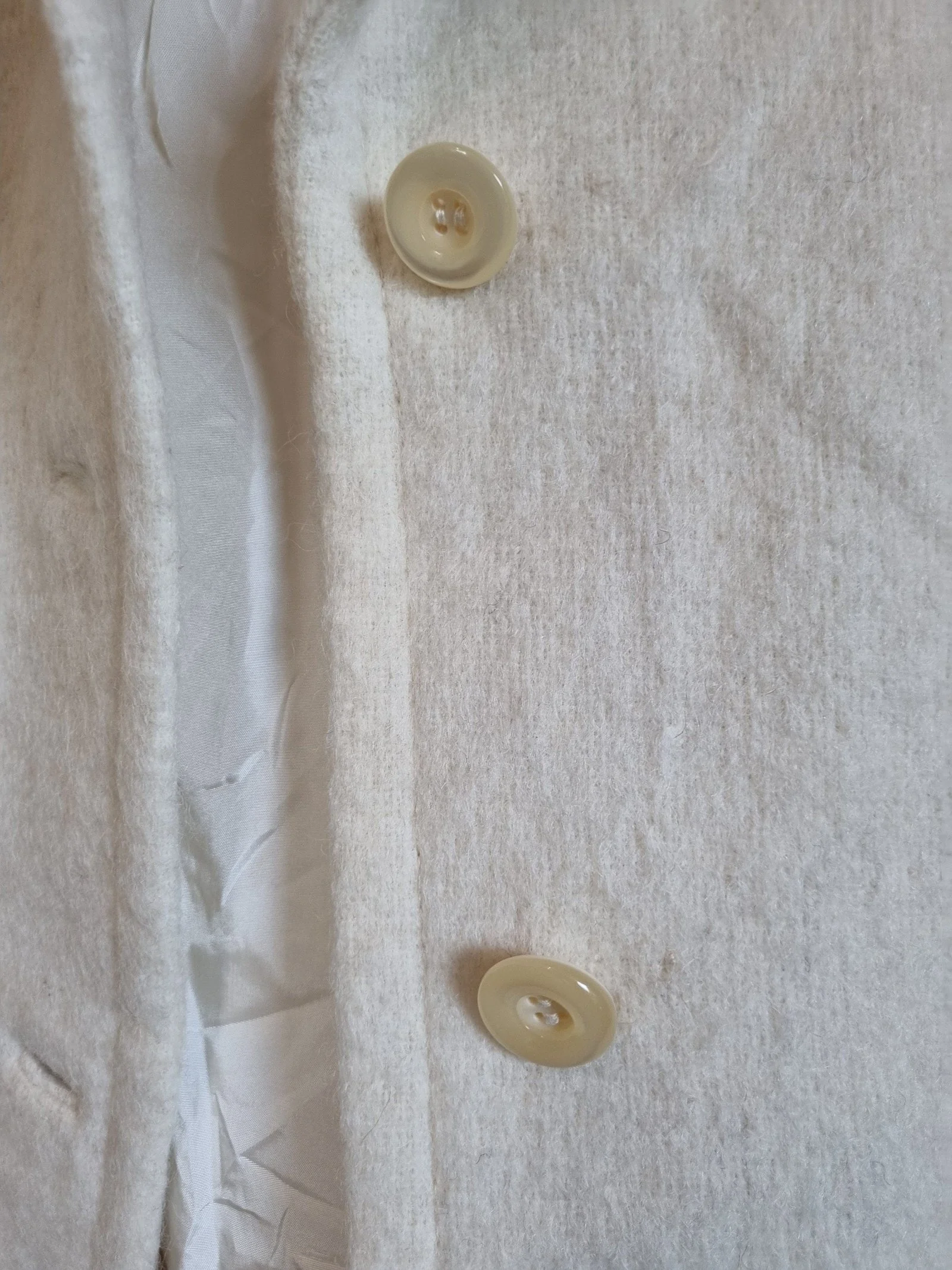 The beauty of this coat lies not just in its design but also in its color. The broken white tone of the garment is timeless, matching perfectly with almost any outfit you might have in your wardrobe. The colour is in excellent condition, and adds a fresh look to the otherwise sophisticated, vintage charm of the coat.