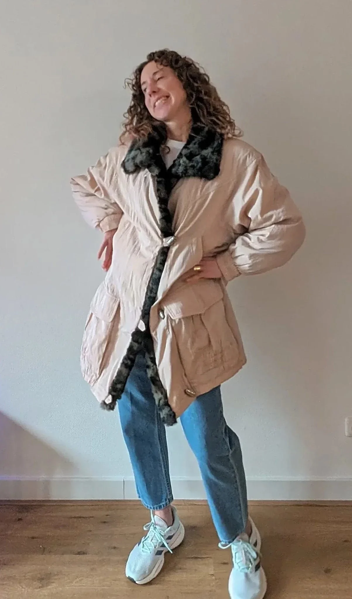 Wrapped in warmth, the coat features a faux fur lining in a rich brown hue that feels just as luxurious as it looks. The outer shell is a classic beige, versatile enough to pair with just about anything in your closet. With long sleeves to keep the cold at bay, this coat is tagged as a size large, but hey, don't shy away from rocking it oversized as our model does – it's a look that's both comfy and stylish.
