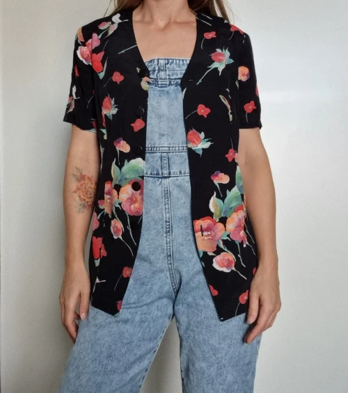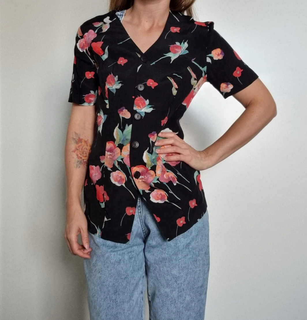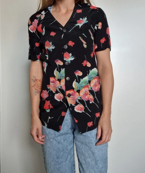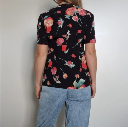 This lovely floral blouse from the 1990s has a more formal and fitted cut than the other listings. The flowerprint colours pop and you can wear it as an addition to a formal outfit or as more more informal blouse on a jeans for example.