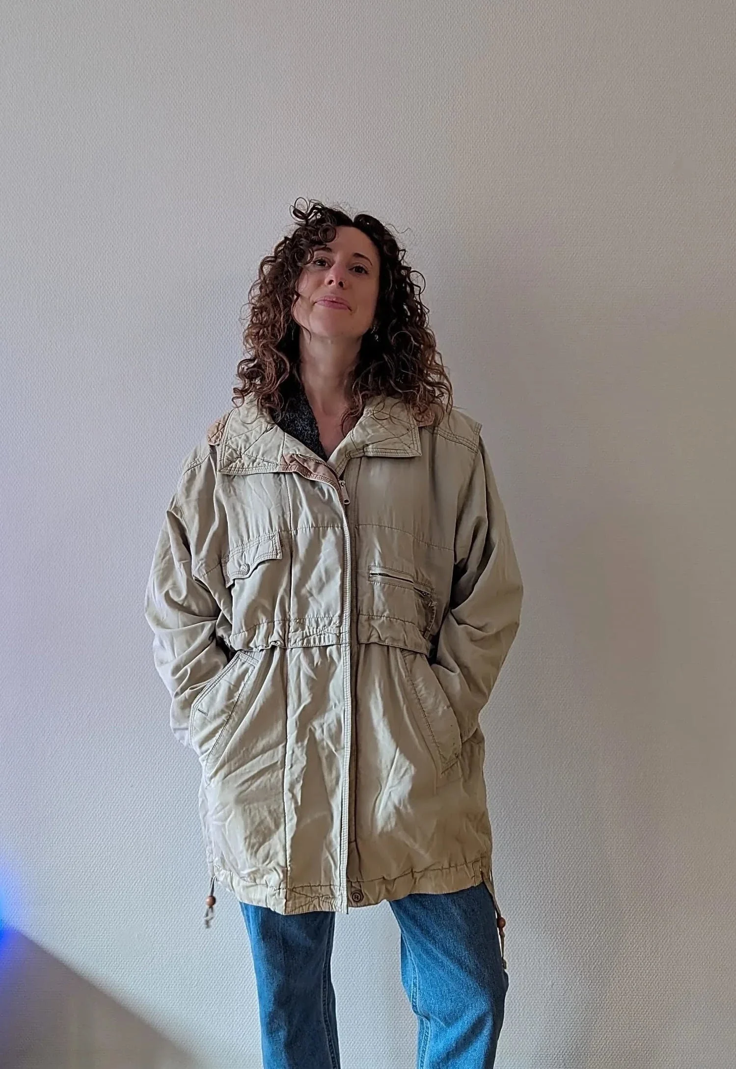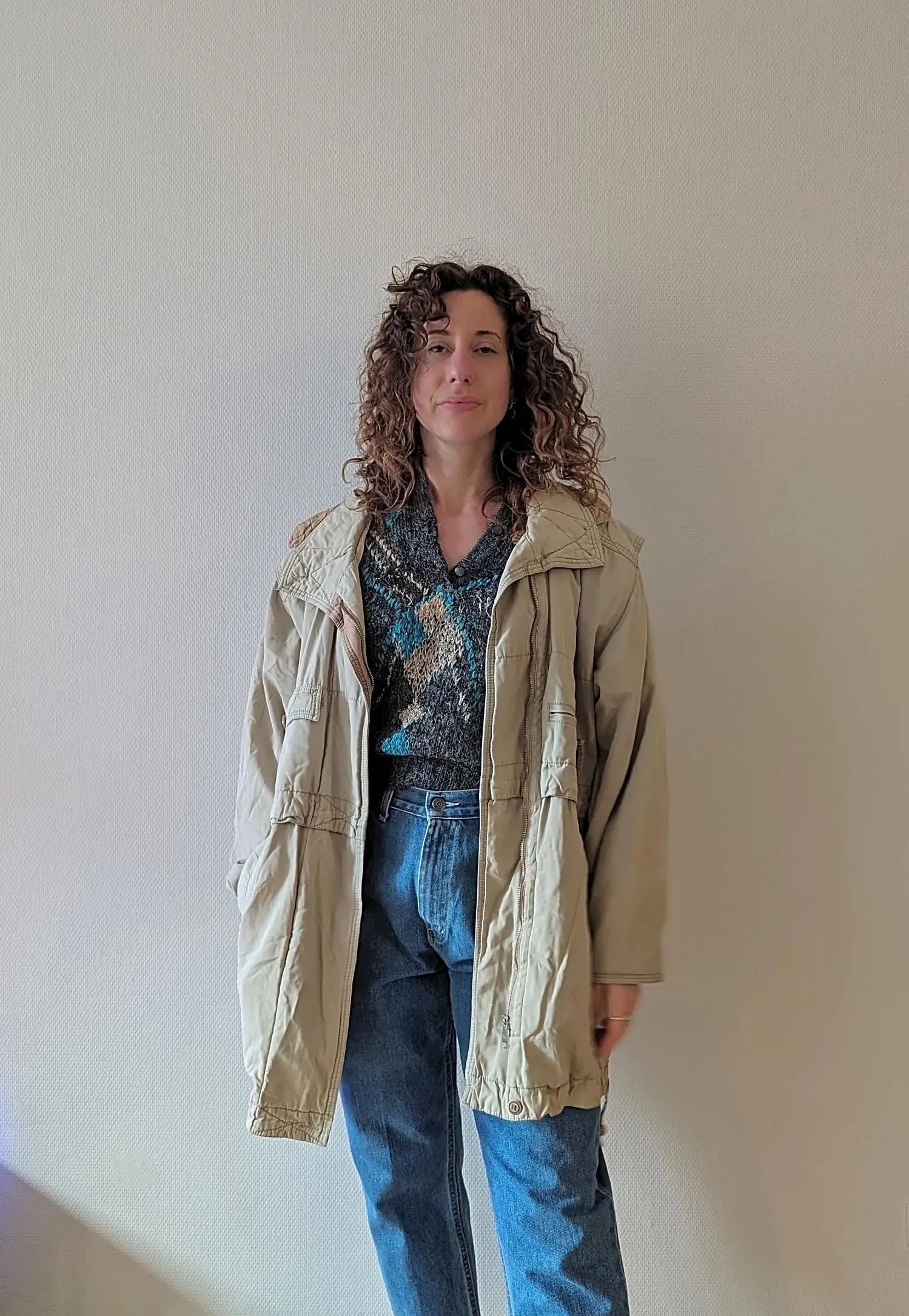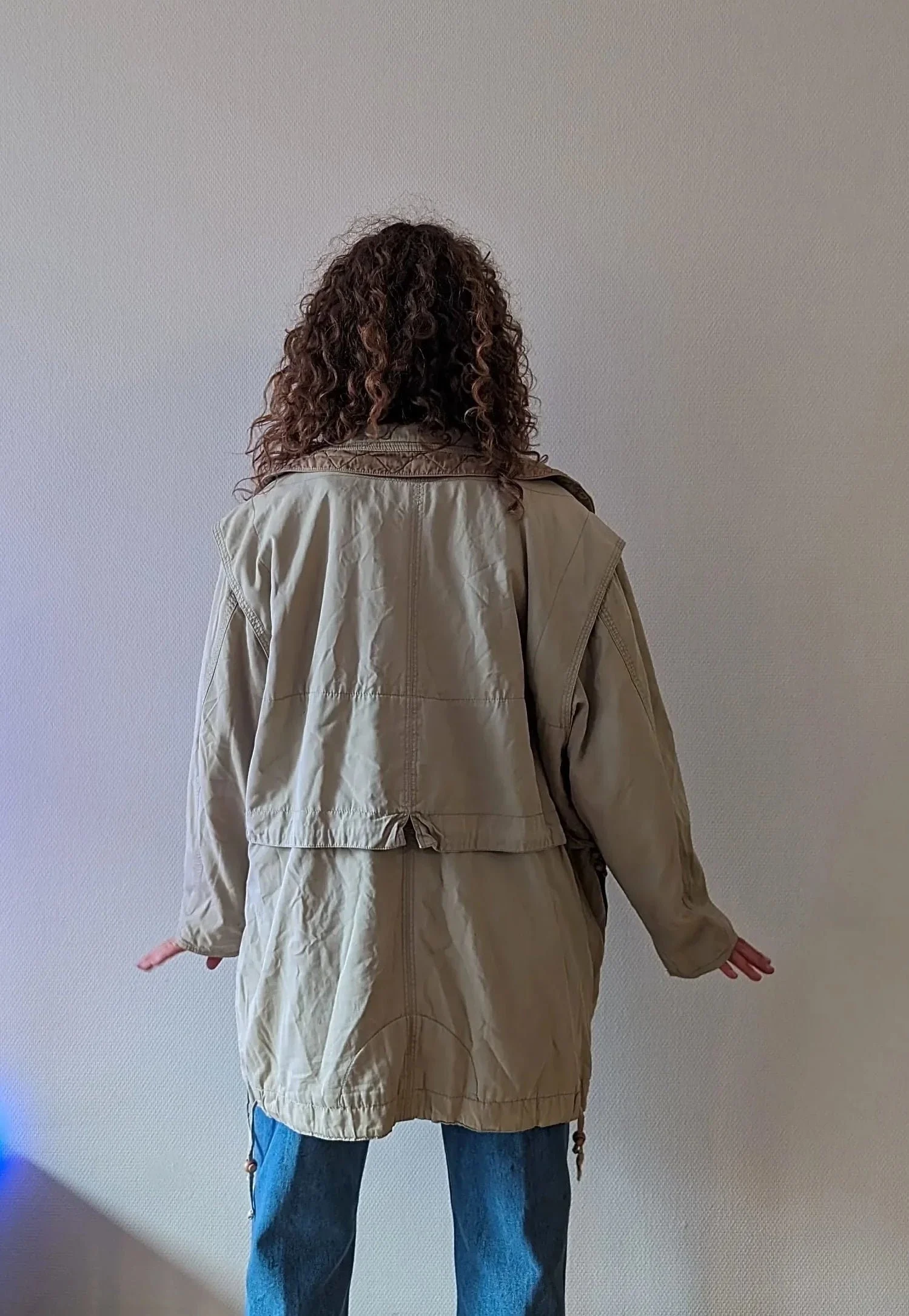 Hey there, fellow style enthusiast! Let's chat about this totally rad coat straight from the 1990s. Picture this: a cool beige-grey hue that gives off a subtle, almost camouflage-like vibe. It's the kind of coat that whispers "adventure" with its knee-length cut, ready to stride into those in-between seasons with ease.