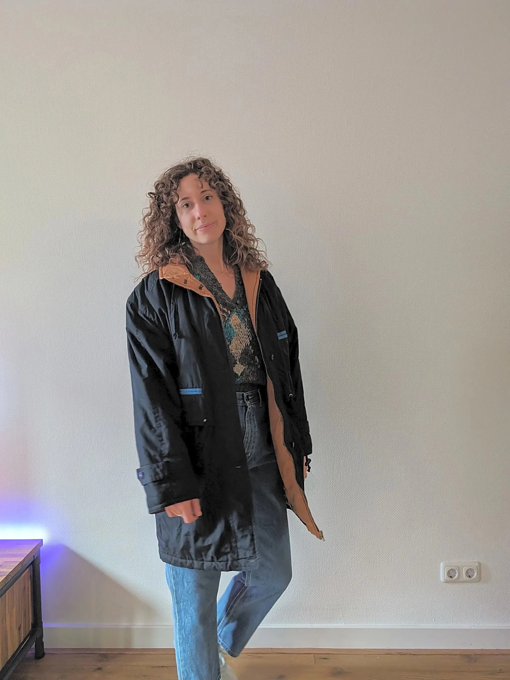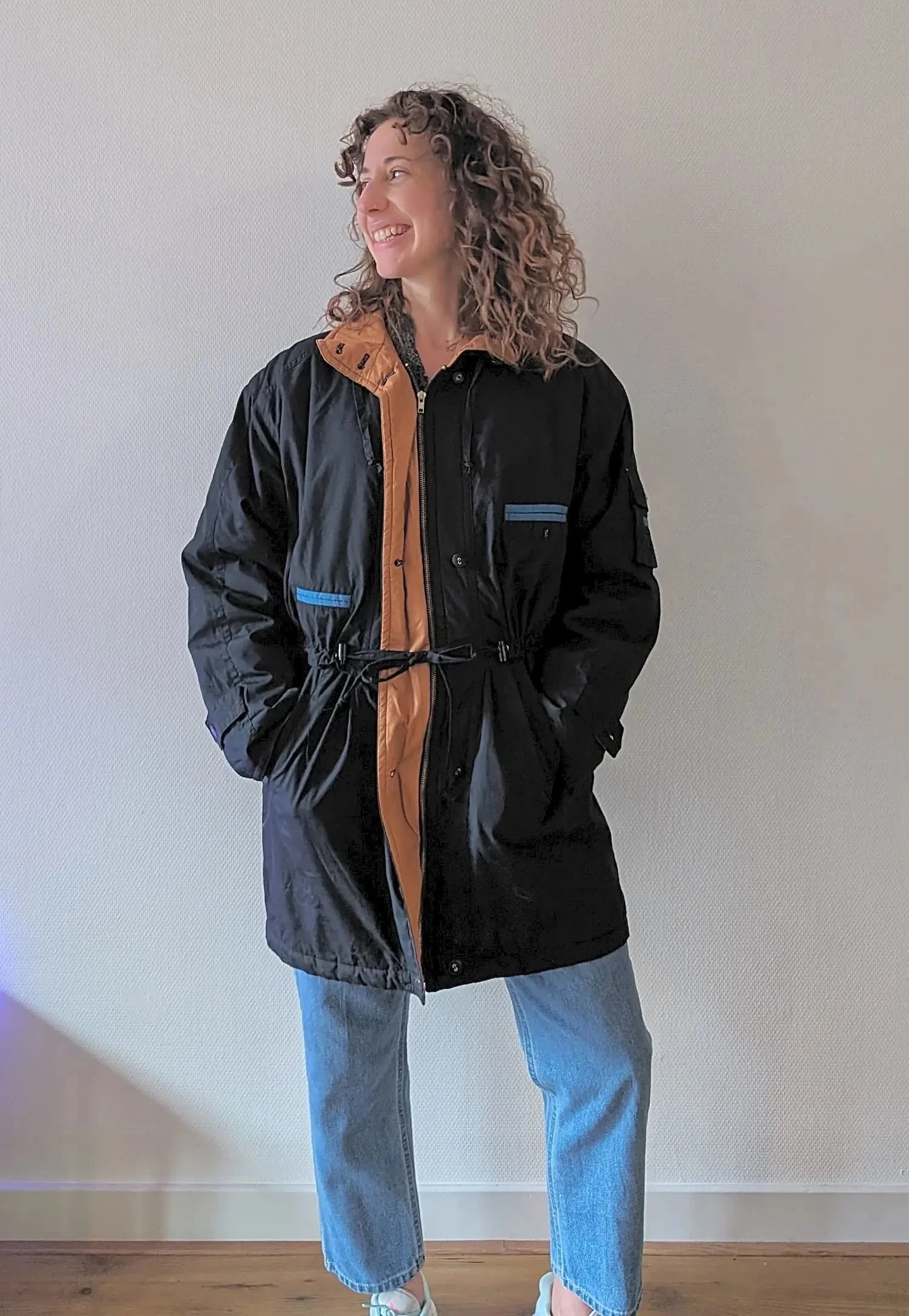 Step out in style with this classic vintage coat straight from the 90s, a perfect blend of function and retro fashion. Its dark blue hue is tastefully accented with light blue and camel light brown, giving it a unique touch that stands out in a sea of plain raincoats. Falling gracefully above the knee, this coat offers a versatile silhouette; thanks to the adjustable cord at the waist and the hem, you can cinch it for a more tailored look or leave it relaxed for a casual, sporty vibe.
