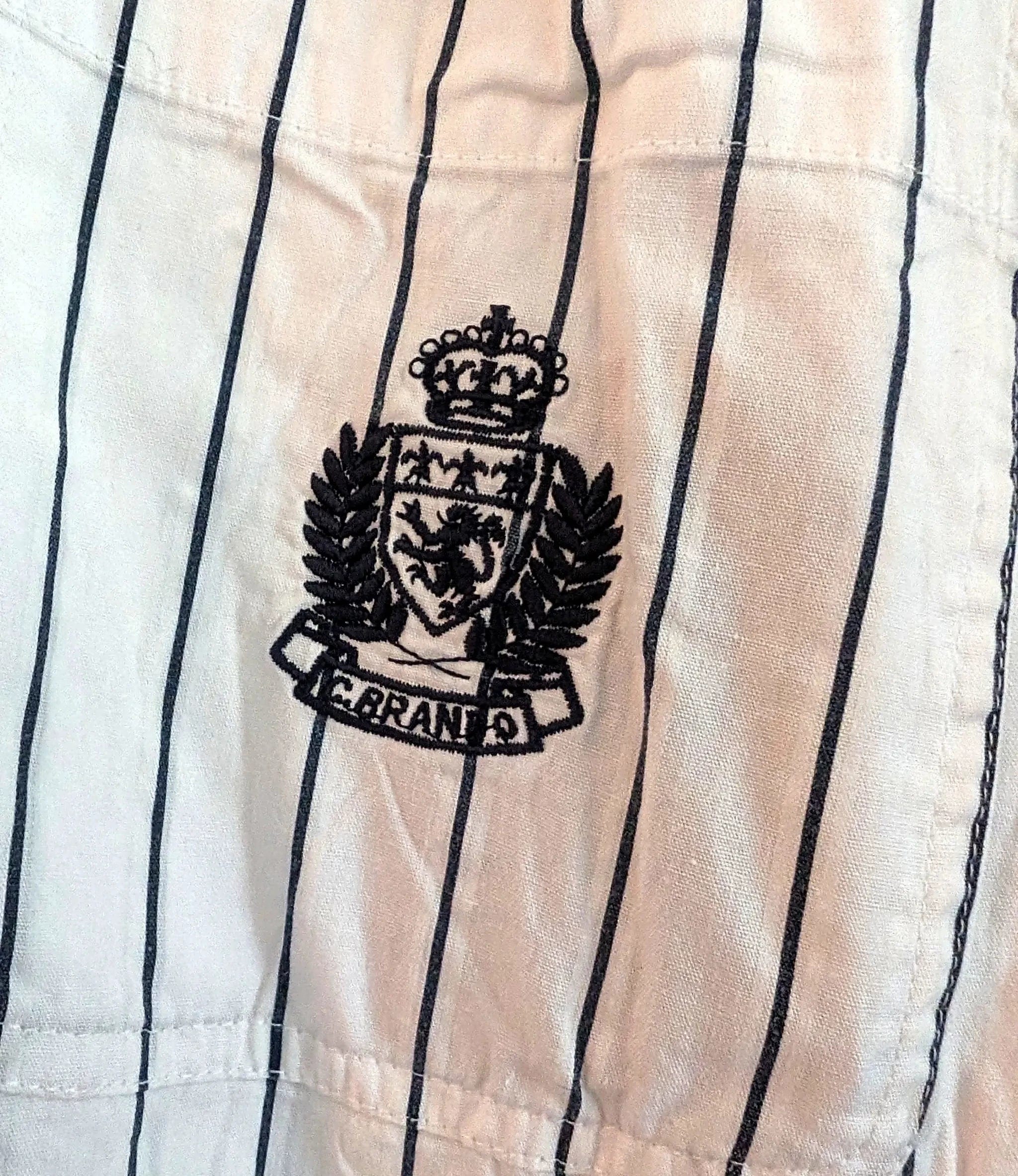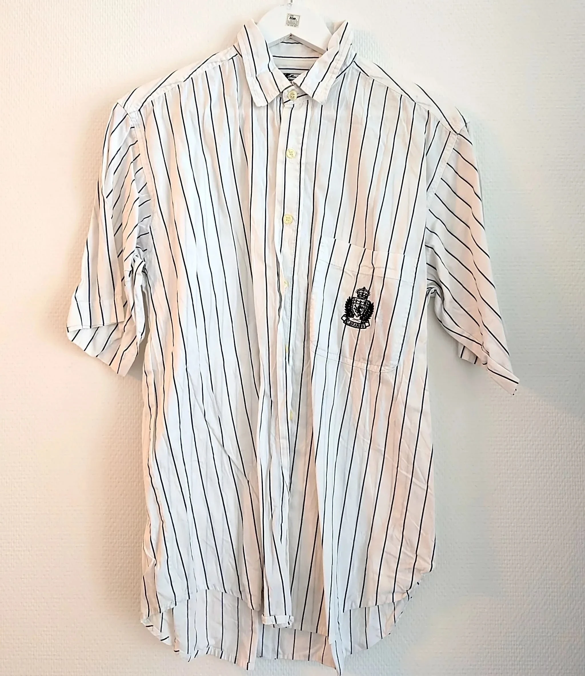 Hey there! Let’s chat about this classic vintage men’s shirt that’s just landed in our collection. Picture this: crisp white fabric, neatly accented with vertical black stripes that give it a timeless charm. It’s the kind of shirt that whispers ‘effortlessly stylish’ without trying too hard.